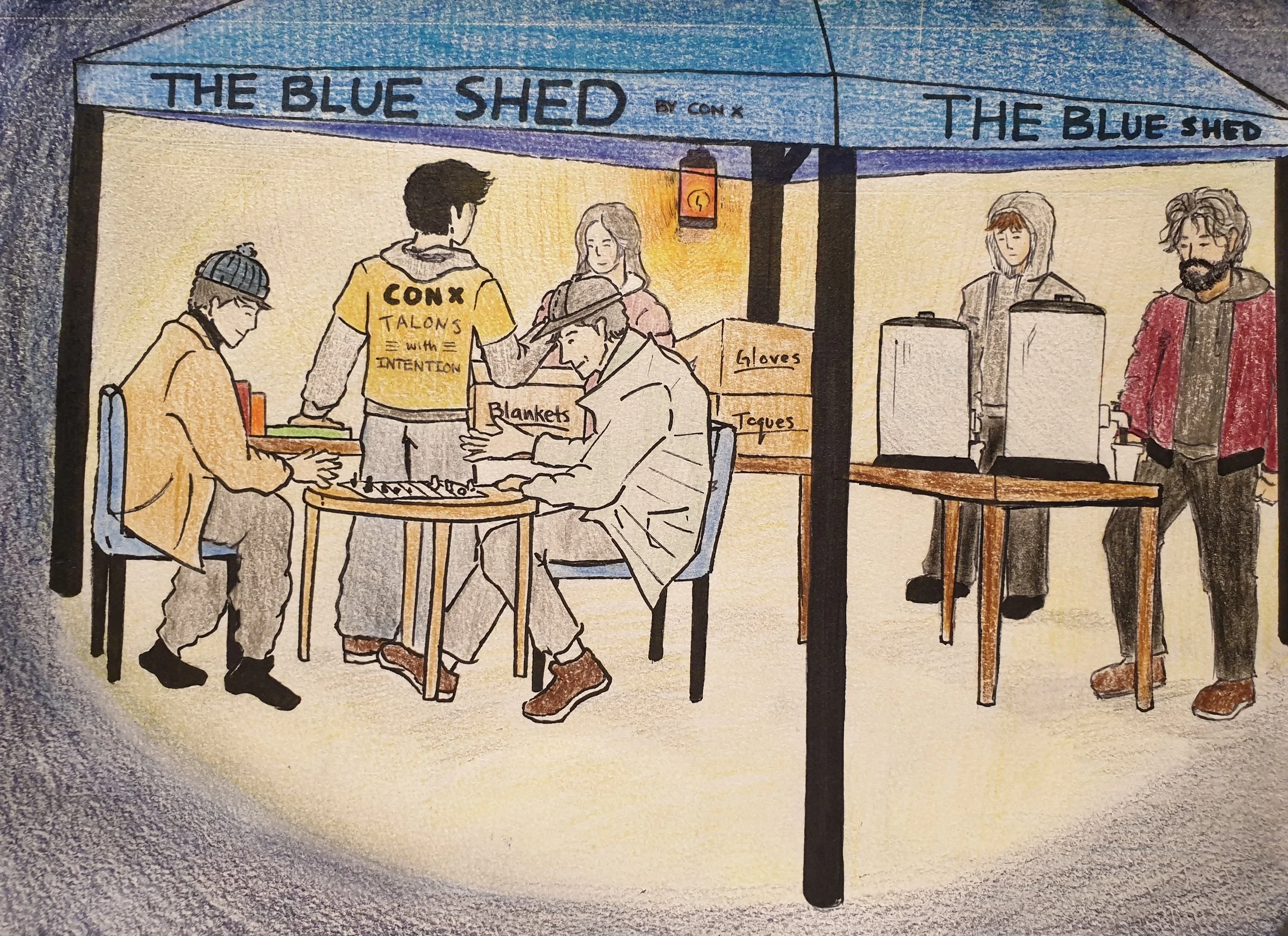 Initially the students wanted to create a safe physical space – a place they called The Blue Shed – where people could come to rest, warm up, get hot chocolate and have conversations. The students envisioned a welcoming place where people could connect and find some respite from the struggles of being on the street.
